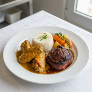 Plat P1 GEMRCN rentable et responsable : coût portion maîtrisé, approvisionnement 100% bio/durable, zéro déchet (parures = fond maison). Parfait pour cantines collectivités engagées. Déclinable : tofu, champignons (alternative vég), texture modifiée enfants.