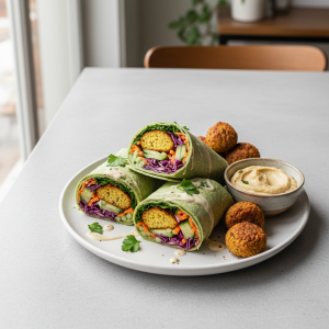 - Assemblage à +10 min avant service : répartir 50g falafels chauds + 30g crudités + 40g sauce + feuilles de laitue fraîche par tortilla bio (180g/pièce). Enrouler serré, servir immédiatement à ≥+63°C.