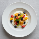 - J, 2h avant service : Laver et préparer fruits selon saisonnalité (ôter queues, pépins, dénoyauter si nécessaire). Découpe uniforme 8-10mm. Placer en bac GN inox, couvrir film alimentaire, conserver chambre froide ≤+3°C.