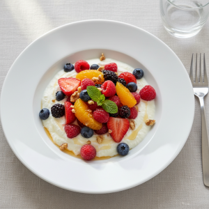 - Dressage (30 min avant service) : Verser 150g yaourt en base barquette/verrines. Répartir fruits préparés en couronne (80g/portion). Miel d'acacia AOP en filet léger (QS, 5-8g/portion si fruits peu sucrés). Vanille en poudre : 1 trait discret. Maintenir ≤+3°C jusqu'à service.