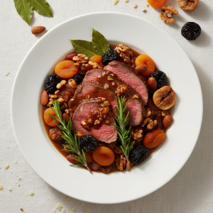 Rôti fruits secs : gourmandise naturelle sans sucre ajouté, ingrédients bruts de qualité, cuisson simple maîtrisable. À adapter sans gluten (sauce à base fécule), végétarienne (betteraves), ou sans sulfites (abricots secs bruts). Conseil : achetez bio/local — le goût et la santé en valent la peine.