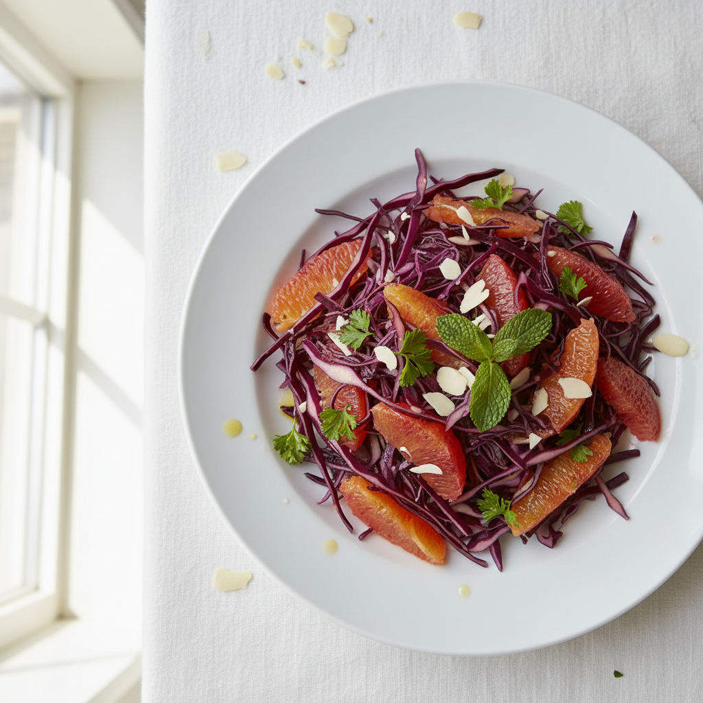 Cette salade, c’est l’exemple même du simple qui marche : des produits bruts, une technique basique (découpe), et beaucoup de goût. À servir bien fraîche, dès la préparation. Vous pouvez la faire le dimanche pour les repas de la semaine (elle tient 3-4 jours au frigo dans un bac hermétique, chou et oranges séparés).