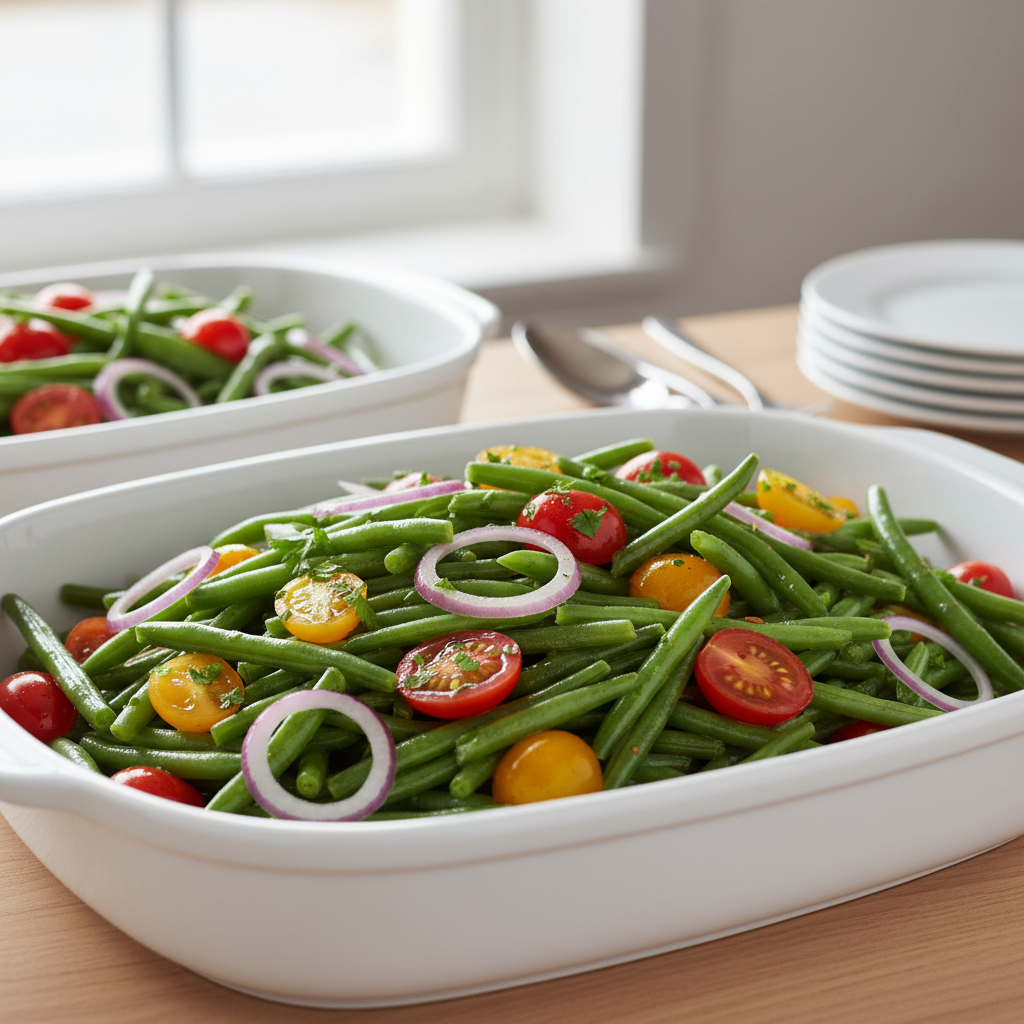 - Achat : Choisissez haricots verts fins frais (couleur vert vif), tomates cerises croquantes, oignons rouges charnus chez le maraîcher ou AMAP locale.