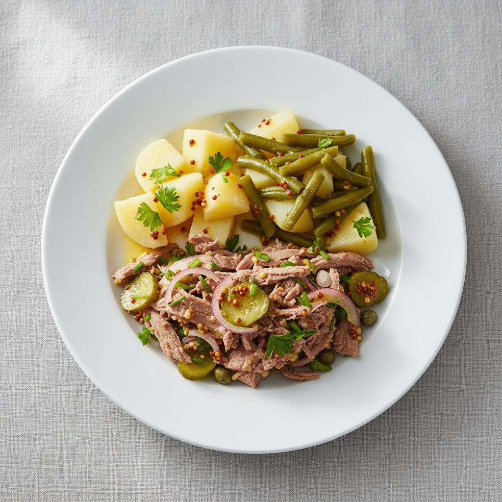 Cette salade de museau de bœuf est une vraie recette de cuisine française, généreuse et économique. L’abat, injustement délaissé, offre une viande tendre et savoureuse, riche en protéines et collagène. Avec une vinaigrette moutardée maison et des légumes frais, c’est un plat équilibré qui mérite vraiment d’être redécouvert.