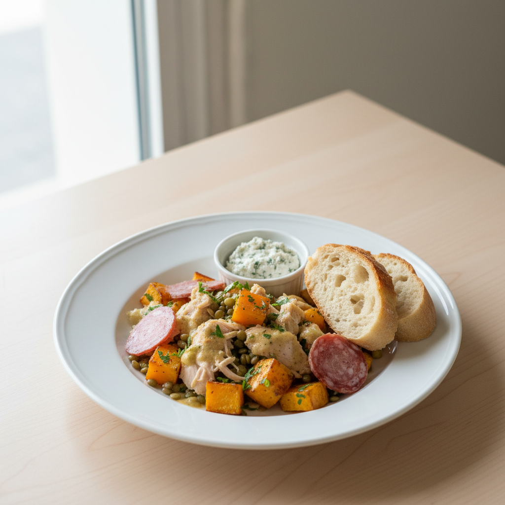 Le pâtisson, c’est cette petite courge toute ronde et verte qu’on découvre au marché d’été — doux, sucré, délicieux rôti. Voici une salade fraîche, colorée, simplement bonnes matières premières : féta crémeuse, grenade acidulée, menthe vivante.