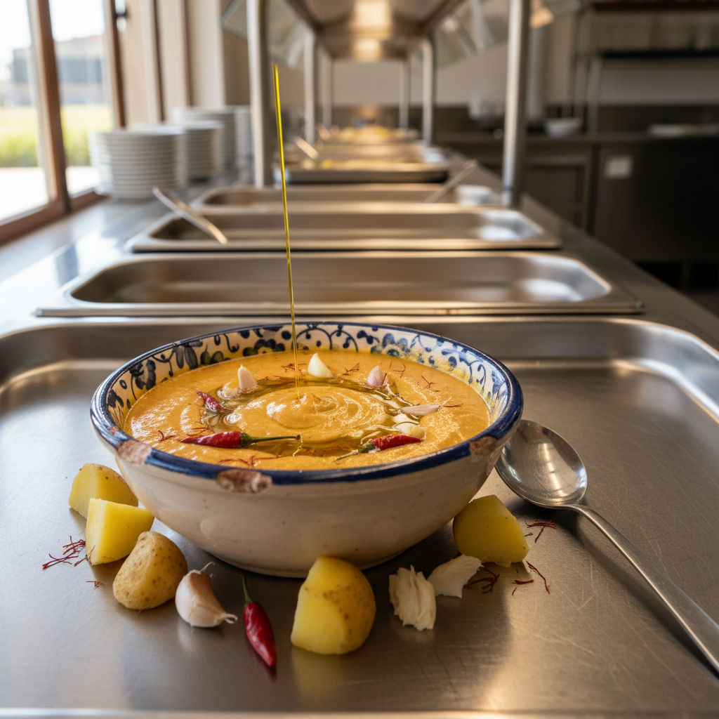 - 4. L'ÉTAPE CLEF — L'émulsion : Mettre 6 jaunes d'œufs bio dans un bol. Fouetter fort. Faire infuser une bonne pincée de safran dans 50 mL de votre bouillon tiède (5 min). Verser le safran dans les jaunes. Commencer à verser l'huile d'olive goutte par goutte en fouettant sans arrêt (c'est long, mais c'est comme ça que ça « prend »). Une fois que c'est crémeux, versez le fumet froid doucement, toujours en fouettant. Vous obtenez une crème épaisse dorée.