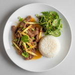 - À la toute fin, hors du feu : verser basilic thaï frais ciselé (200g). Mélanger délicatement. Servir chaud (idéalement immédiat pour garder arômes frais). Goûter, ajuster sucré/salé à votre goût.