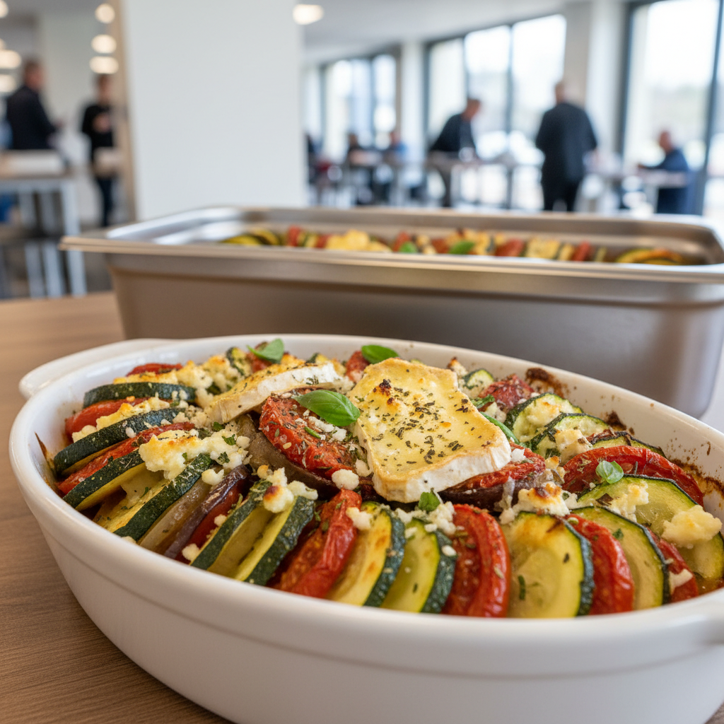 - La veille (J-1) : Émincer un gros oignon. Dans un plat à gratin : couche courgettes égouttées → tomates en conserve → oignon → couche aubergines → tomates → oignon → fromage chèvre émietté. Saupoudrer herbes de Provence. Couvrir film et ranger frigo toute la nuit.