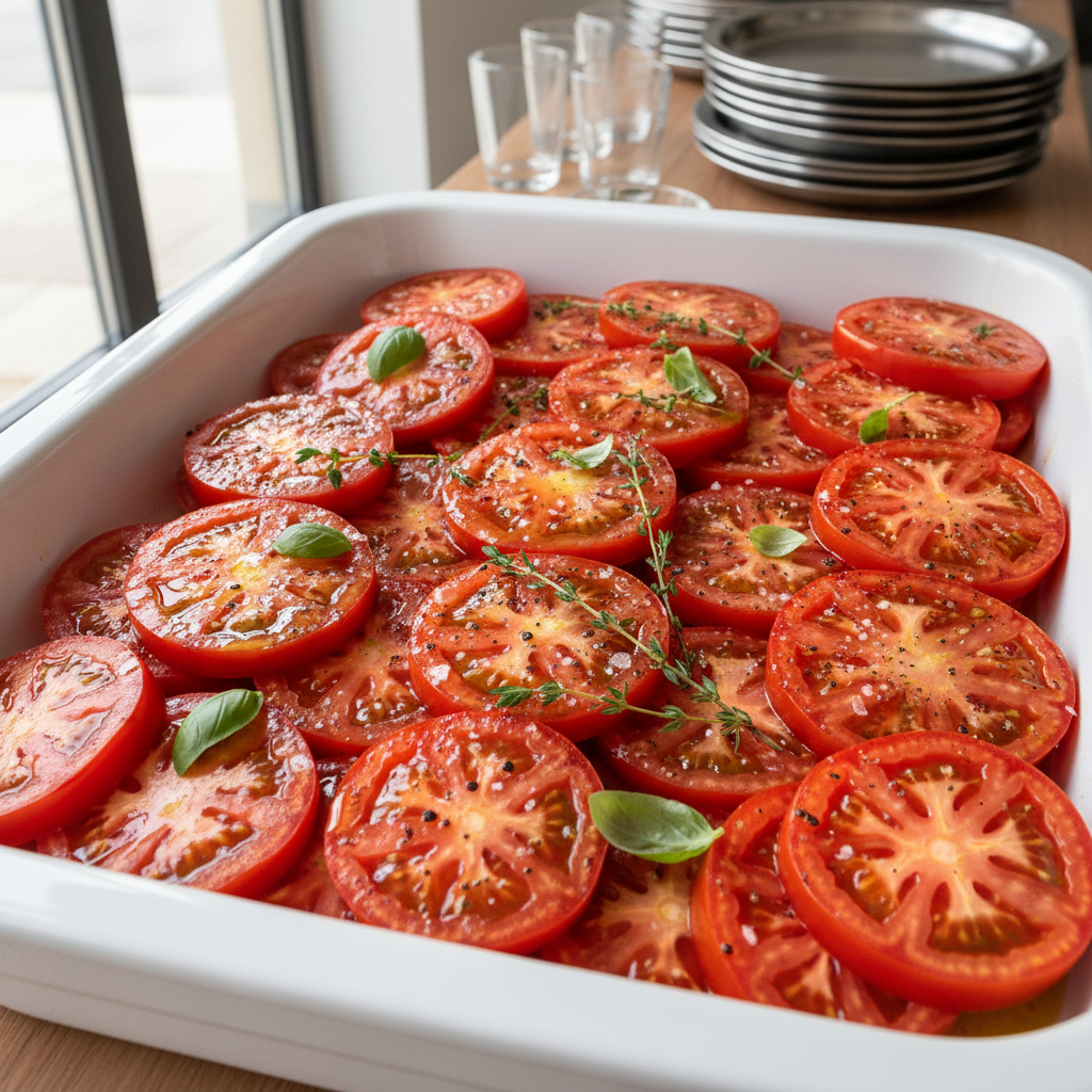 - Cuisson : préchauffez four ou gril +180°C. Posez tomates peau vers bas sur tôle. Cuisson 20-25 min : elles doivent être tendres, peau légèrement rôtie, jus caramélisé au fond.