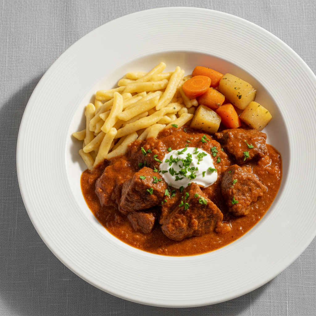 Envie d’un plat chaleureux et parfumé qui réchauffe toute la tablée ? Ce goulash de veau aux légumes frais, mijoté avec du paprika hongrois et de la crème, est un voyage culinaire à portée de casserole. Privilégiez des produits frais du marché (tomates, poivrons en saison) et une viande de qualité chez votre boucher : le résultat sera fondant, généreux et plein de saveurs.