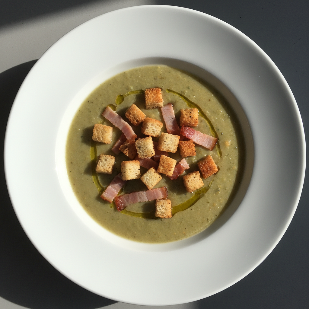- Dressage : Verser velouté chaud dans bols, ajouter croûtons dorés, trait d'huile d'olive crue, parmesan râpé optionnel (ou levure nutritionnelle vegan).