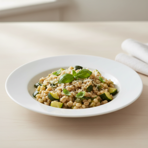 Orzotto de blé bio aux courgettes fraîches, technique traditionnelle de nacrage et mouillage progressif pour crémeuse naturelle sans matière grasse excessive. Plat G2 100% végétal, EGAlim compliant, valorisant circuits courts régionaux. Portion économique 150g, rendement 95%.