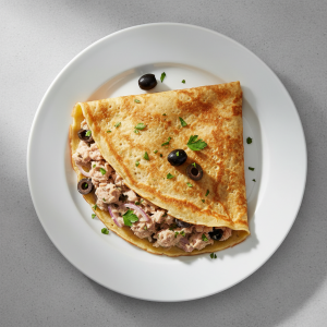 Déclinaisons : Texture modifiée (dysphagie) : crêpe très moelleuse, thon en miettes fines, sauce lissée. Alternative végétarienne : substituer thon par pois chiches cuits + parures de tomate concassée. Variante bio : tous les ingrédients certifiés ECOCERT minimum. Sans allergène œuf : utiliser pâte crêpe sans œuf (fécule maïs + lait végétal, test préalable obligatoire).