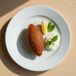 Déclinaisons : Texture modifiée : Kibbeh écrasée (purée viande-boulgour) pour troubles de la déglutition, service à la cuillère. Alternative végétarienne : Kibbeh aux lentilles corail + tournesol haché (protéines équivalentes), même façonnage et cuisson. Variante bio : Tous ingrédients certifiés AB, pignons de pin bio ou remplacés par tournesol grillé bio. Sans allergène : Sans pignons (remplacer par tournesol), sans gluten (boulgour par riz/quinoa broyés), sans lait (beurre clarifié déjà exempte).