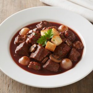 Déglacer avec 1,8L vin rouge corsé AOC régional. Ajouter bouquet garni, saler 10g/kg. Porter 85°C.