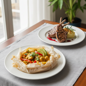 Papillote poulet curry-coco : protéine maigre en cuisson basse température (180°C), légumes bio croquants, lait de coco sans lactose. Incontournable menu équilibré GEMRCN P1, 70% produits durables, zéro déchet parures (valorisation en bouillon).