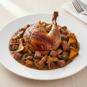 Pintade forestière aux champignons sauvages : un classique de la table française revisité en restauration collective avec produits frais, circuits courts régionaux et certification bio. Cette recette valorise les parures de pintade en fond, réduit les déchets et répond à l'obligation EGAlim (50 % produits durables). Service en liaison chaude à ≥63°C, temps de sauté 45 min pour une cuisson homogène.