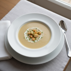 Service : 220-250 ml/portion (verre à pied ou bol). Accompagnement : pain grillé beurrée bio, croutons maison, brindille cerfeuil frais.