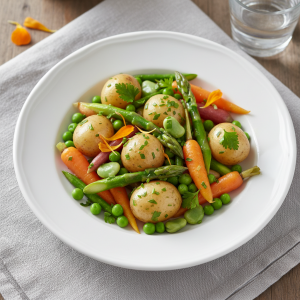 Printanière de légumes frais de saison, cuits séparément pour préserver couleurs et valeurs nutritionnelles. Conformité EGAlim 100% : produits bio certifiés, circuits courts régionaux, beurre fermier. Cuisson basse température vapeur, liaison lait-beurre en dernier moment pour texture fondante et réduction du gaspillage.