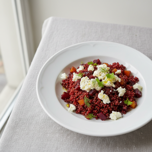 Déclinaisons : Texture modifiée : réduire quinoa en purée, betteraves en écrasé pour enfants <6 ans, ajouter 10 cl bouillon chaud. Alternative végétarienne : déjà conforme, renforcer avec légumineuses (lentilles corail cuites J-1). Variante bio complète : tous ingrédients certifiés ECOCERT. Adaptation sans allergène (noix) : remplacer par graines de courge torréfiées bio, apport minéraux identique.