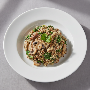Liaison crème : mélanger crème fraîche 120ml (100 cvts) avec muscade râpée QS (0,5g), tempérer 3-5 min à T° ambiante. Incorporer lentement au quinoa + champignons + épinards. Homogénéiser 1-2 min à 63-70°C. Vérifier T° 65°C minimum en trois zones bac.
