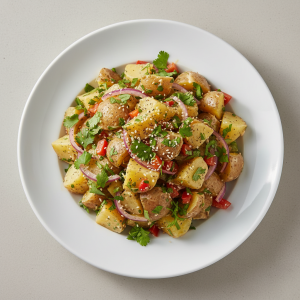 Salade de pommes de terre à l'orientale : entrée végétarienne 100% bio, circuit court, facile à produire en masse. Cuisson vapeur basse temp + vinaigrette fraîche. Conforme EGAlim, coût maitrisé, impact carbone minimal.