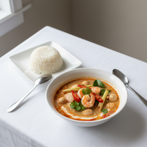 Tom yum équilibré, facile à produire en série. Maitrise HACCP bouillon chaud ≥63°C. Valorise circuits courts (citronnelle/galanga régionaux) et répond EGAlim 50/20 avec 70% bio. Peu d'huile (cuisson bouillon), accessibilité allergénique (déclinaisons protéines).