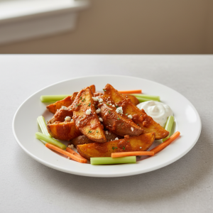 Organisation : J-2 : Sourcer pommes de terre bio circuit court auprès producteur local. J-1 : Éplucher, tailler en wedges, blanchir 8 min à 85°C, refroidir immédiatement glaçons (≤+10°C en <2h), stocker ≤+3°C max 24h. Préparer sauce Buffalo : mélanger Tabasco, beurre fondu, ail poudre, vinaigre blanc, sucre. Conserver sauce ≤+3°C. Jour J : Égoutter wedges, sécher, huile d'olive bio, sel réduit 3g/kg, cuisson four 200°C 20-25 min jusqu'à dorage. Sauce Buffalo servie à température ambiante ou réchauffée ≥+63°C (vérifier HACCP thermomètre). Liaison chaude impérative si service midi.